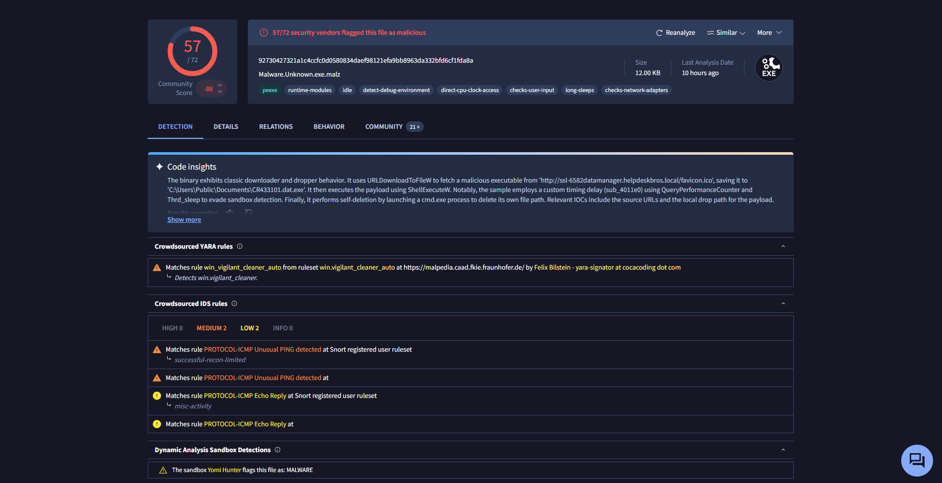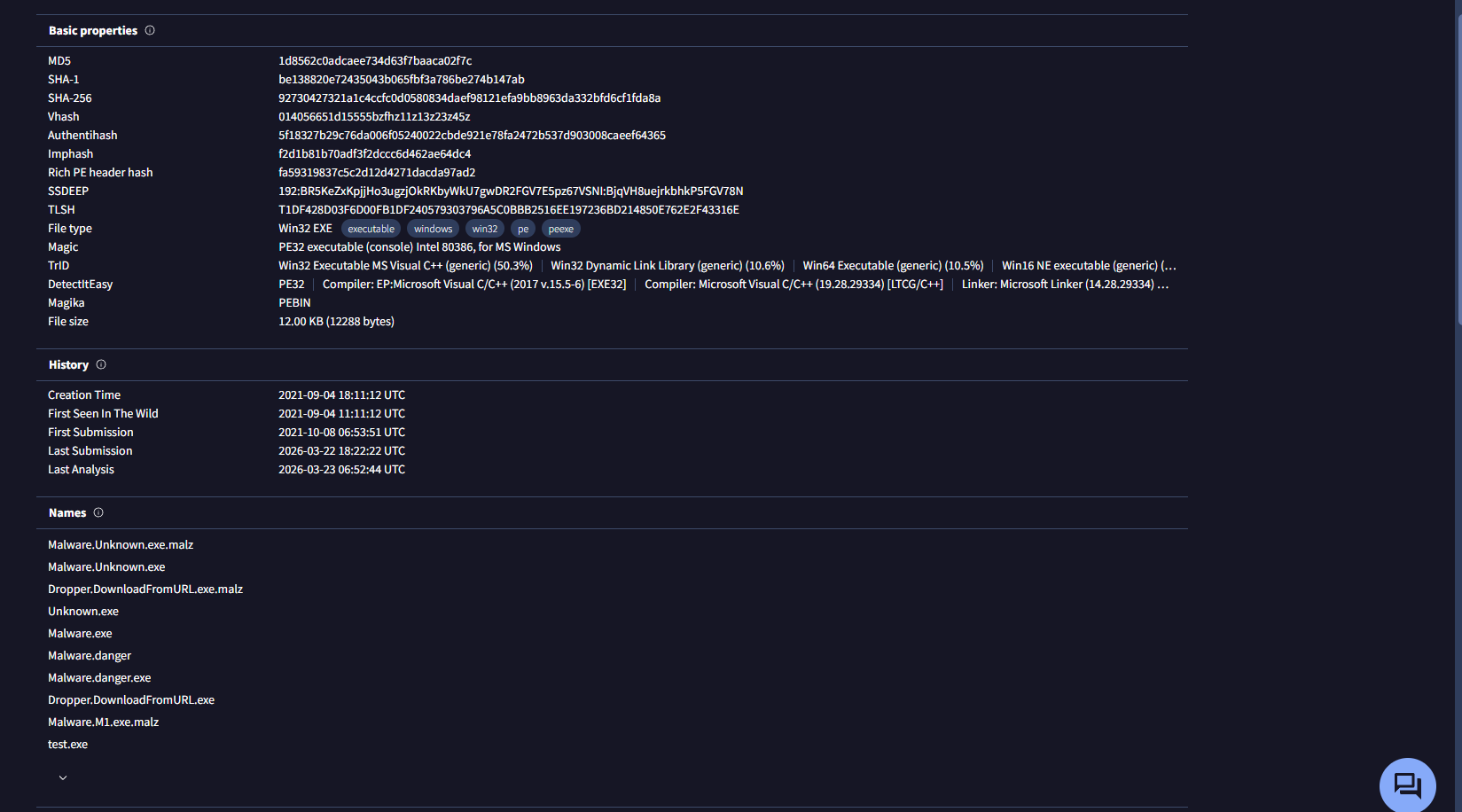 After checking the file hashes in VirusTotal, it was clear that many security vendors already flagged the sample as malicious.