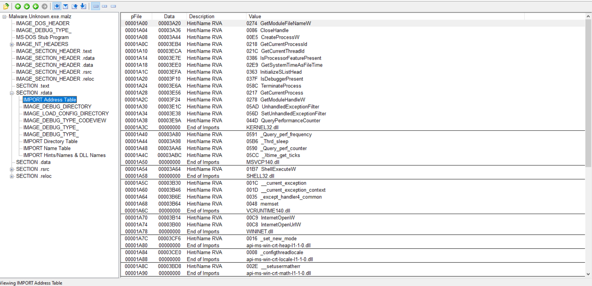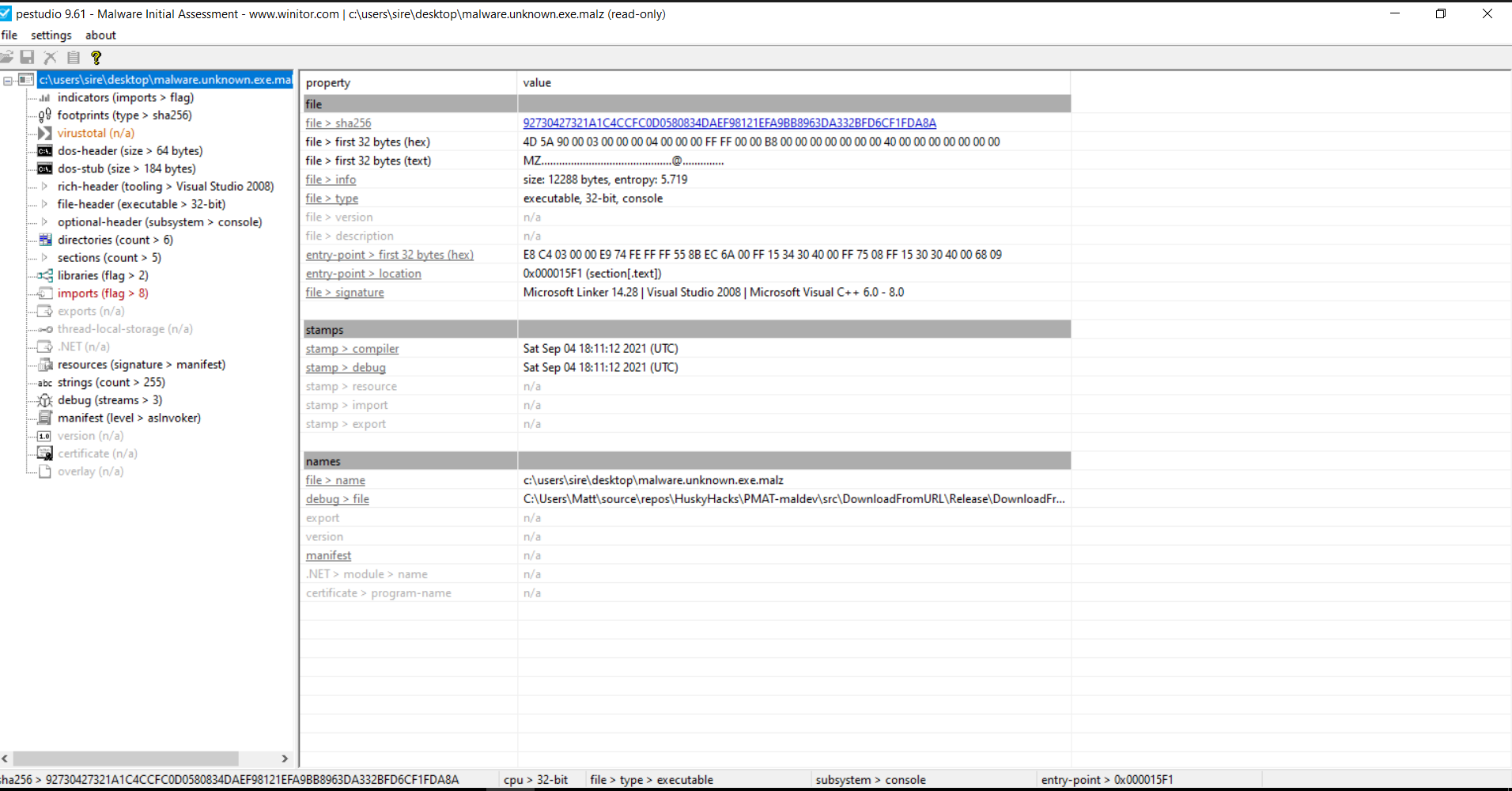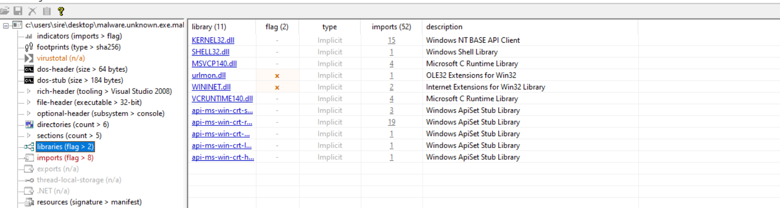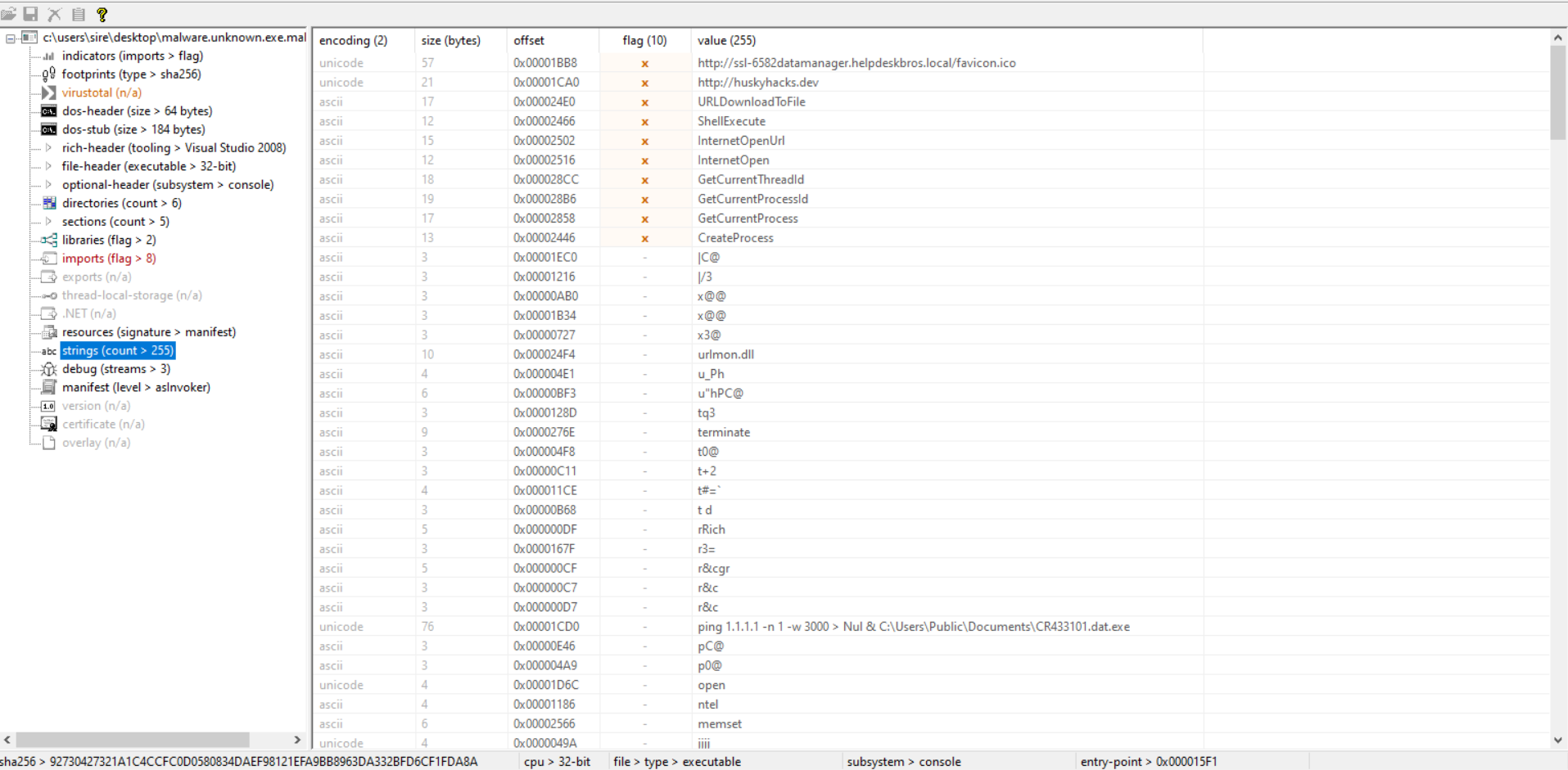 By using hashing, VirusTotal, FLOSS, PEview, PEStudio, and CAPA, I was able to build an early picture of what the sample may do. The malware appears to use HTTP-related APIs, download content from a URL, create processes, and delete files as part of its behavior.