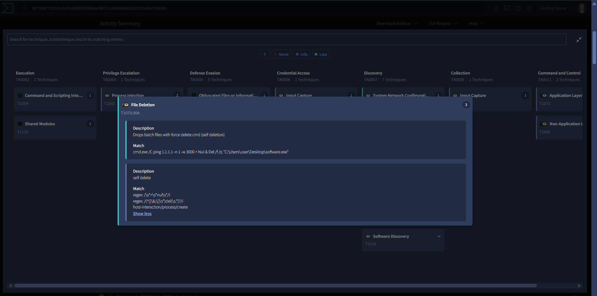 VirusTotal also mapped some of the observed behavior to the MITRE ATT&CK framework. One thing that stood out was behavior related to indicator removal, specifically file deletion through force-delete commands.