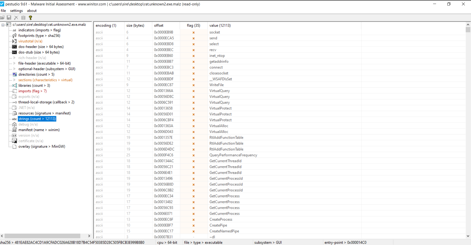 From the strings and PEStudio view, there were not many obvious readable indicators at first. What stood out most were networking-related strings such as: