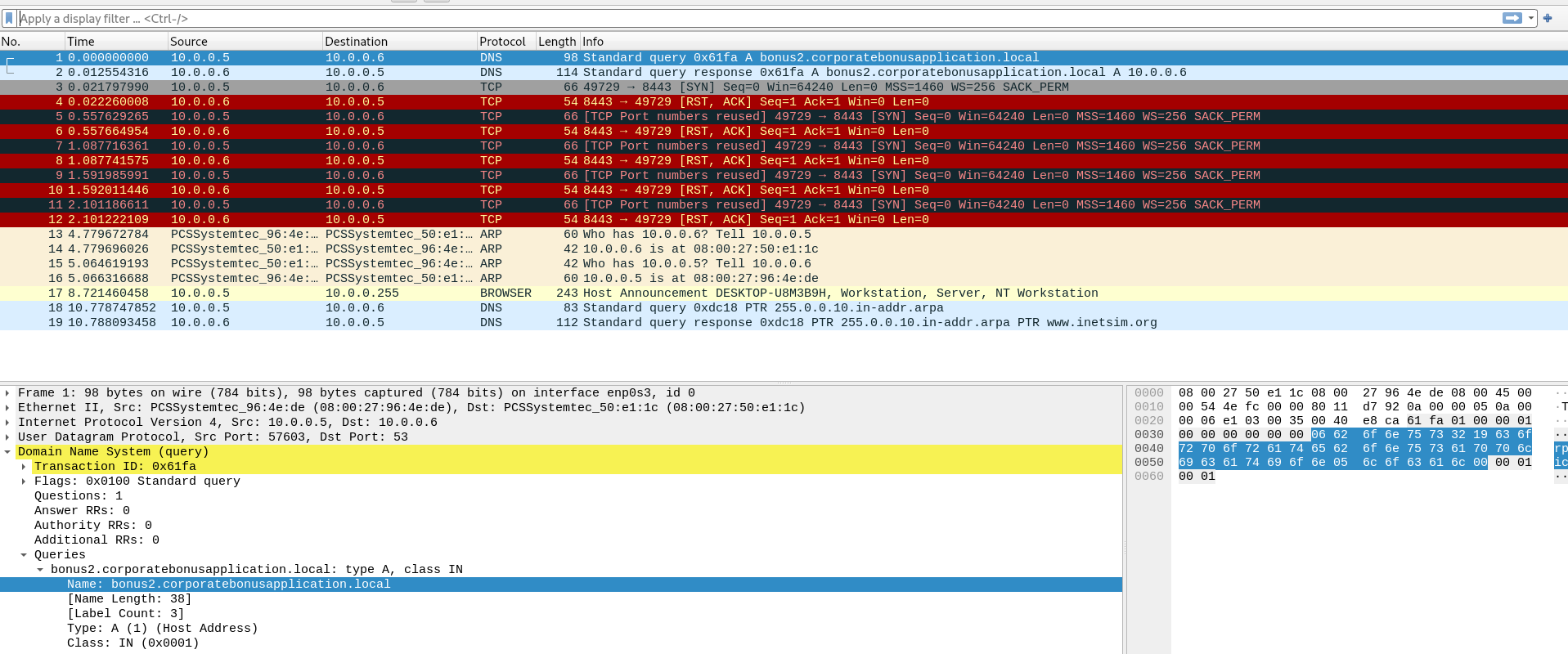 - Wireshark confirmed the DNS query and outbound TCP behavior