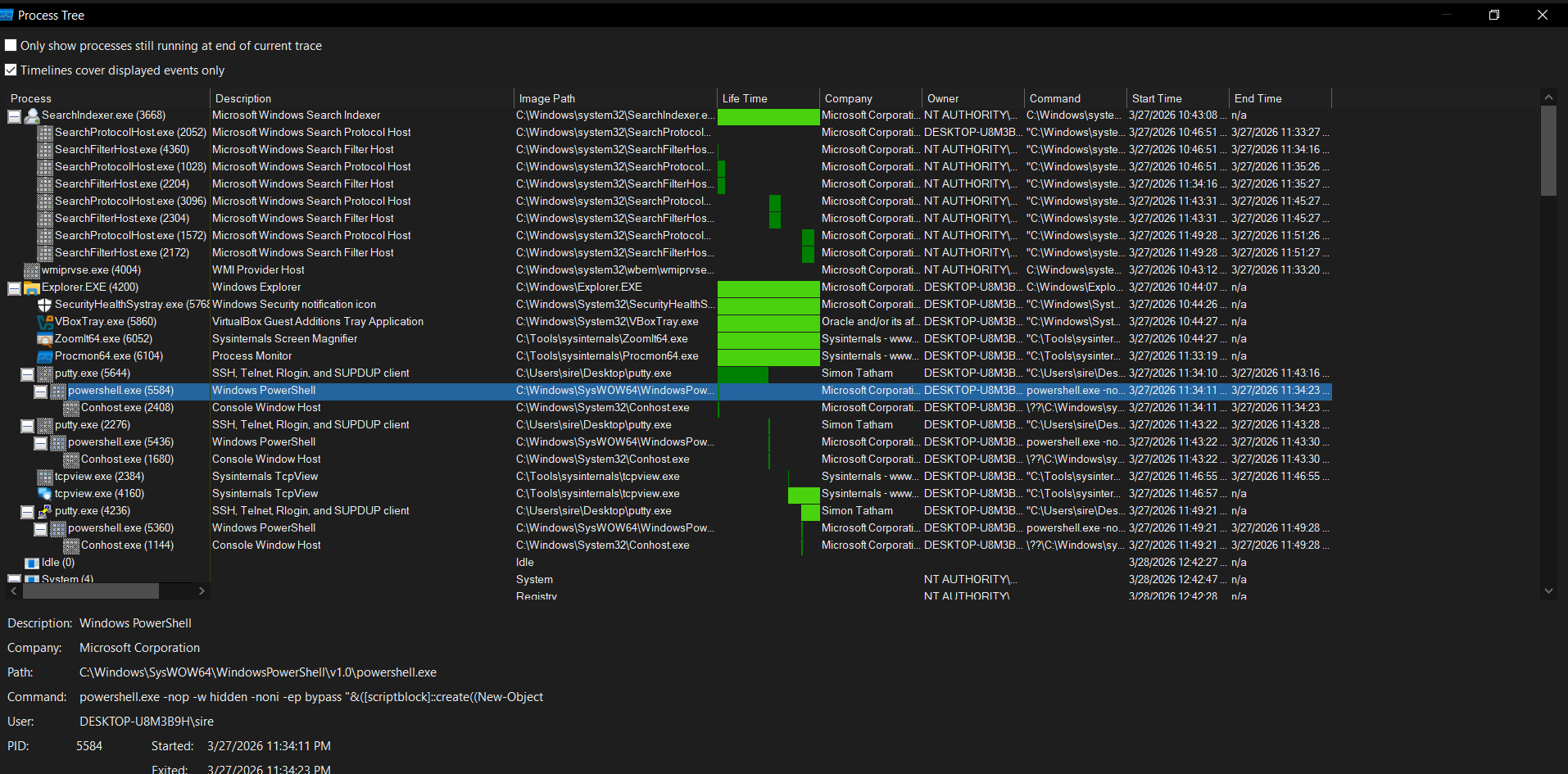 This sample used the appearance of a normal PuTTY executable as cover, but the real malicious behavior was the hidden PowerShell payload embedded inside it. Static analysis showed both legitimate PuTTY strings and one very suspicious one-liner that decoded and executed a compressed script in memory. Dynamic analysis confirmed that PowerShell was launched during execution, a DNS request was made to bonus2.corporatebonusapplication.local, and the sample attempted callback traffic over TCP port 8443. The brief blue window during execution lines up well with the hidden PowerShell process seen later in Procmon and the process tree.