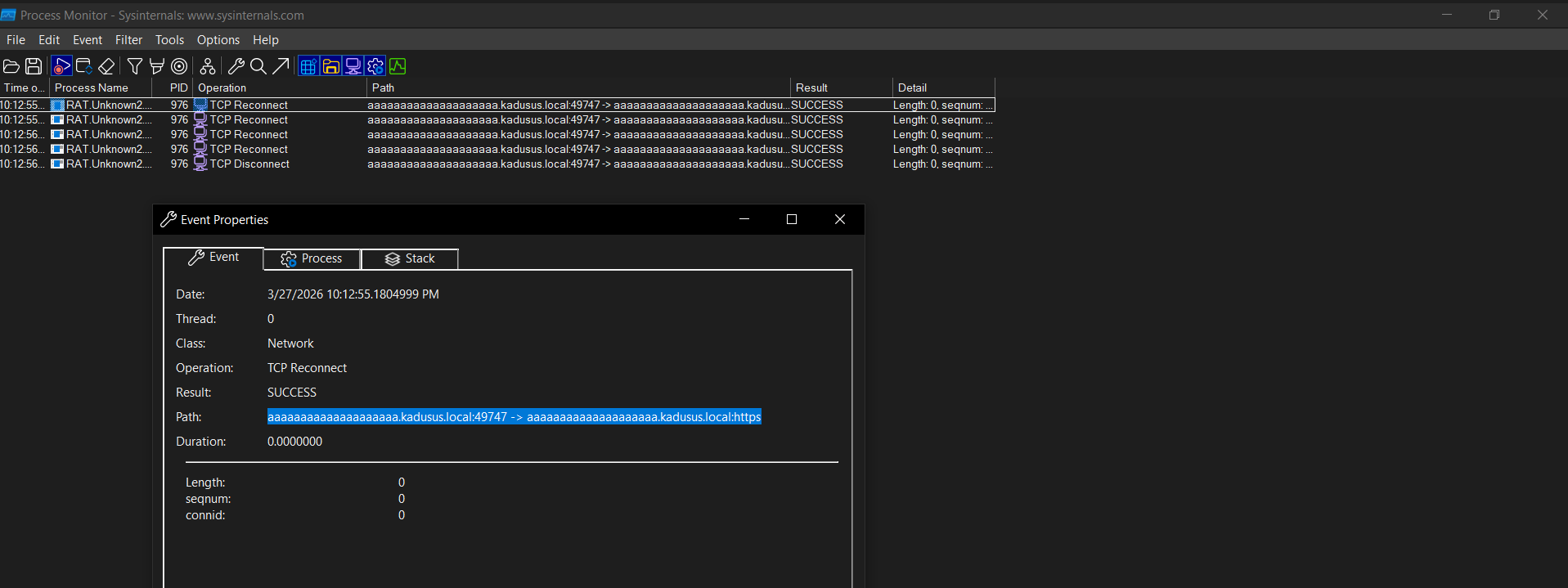 After redirecting the domain, Procmon showed the malware making a TCP reconnect using port 443.
