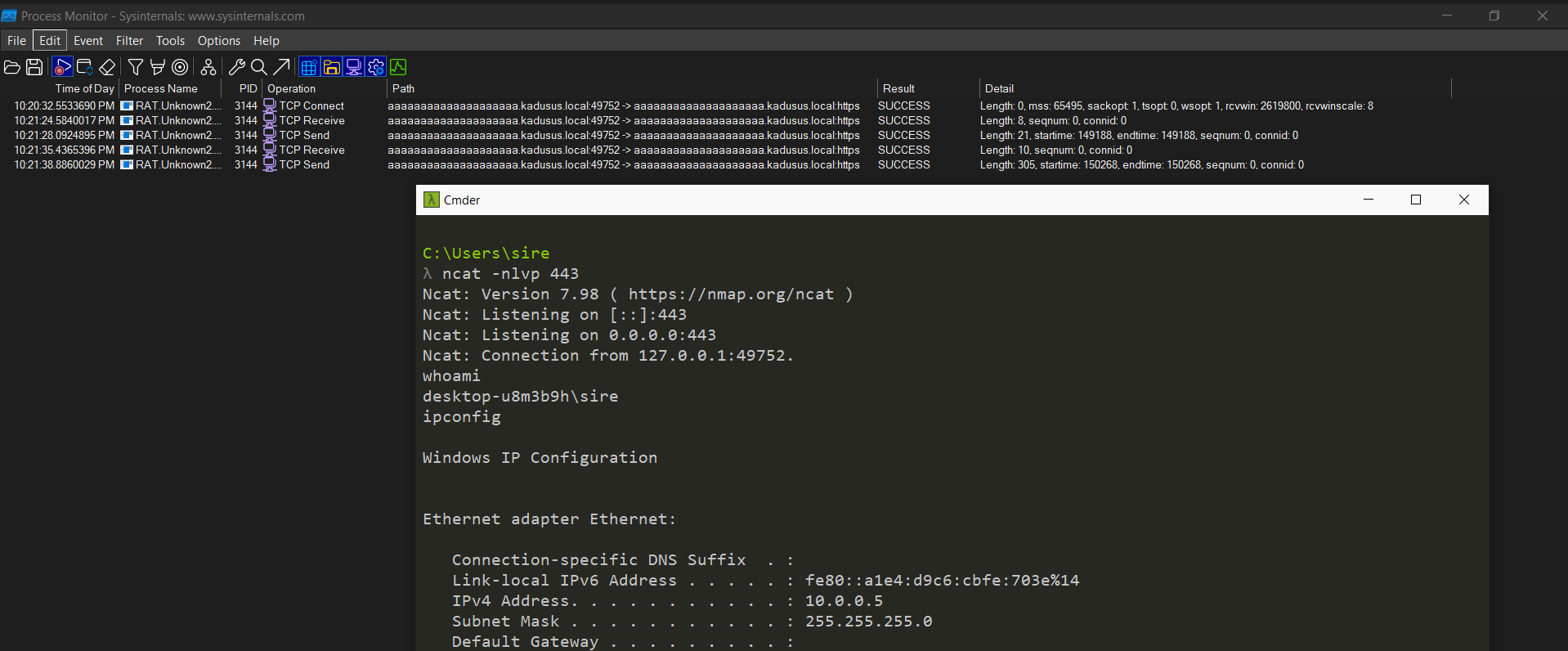 RAT.Unknown2.exe behaved like a remote access trojan. Static analysis hinted at network activity, but the most useful findings came from dynamic analysis. During execution, the sample built a suspicious hostname, queried it through DNS, and then attempted to connect over port 443. After redirecting the hostname through the hosts file, I was able to catch the callback locally and observe command execution. The process tree also showed the malware relying on cmd.exe, which supports the idea that this sample allows remote command execution on the victim machine.