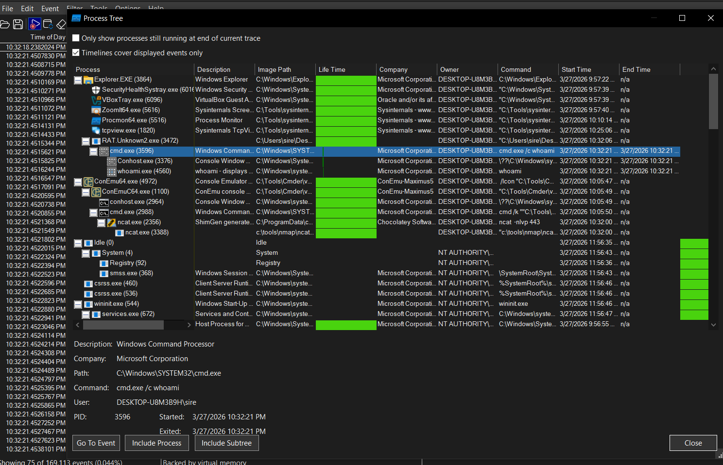 | Execution | Command and Scripting Interpreter: Windows Command Shell | T1059.003 | Procmon and the process tree show the malware using cmd.exe to run commands like whoami. |