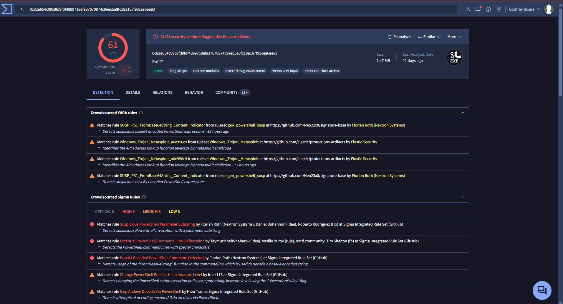 That is what made this sample interesting. On the surface, it still looked like PuTTY. But deeper in the strings output, there was a very suspicious PowerShell command: