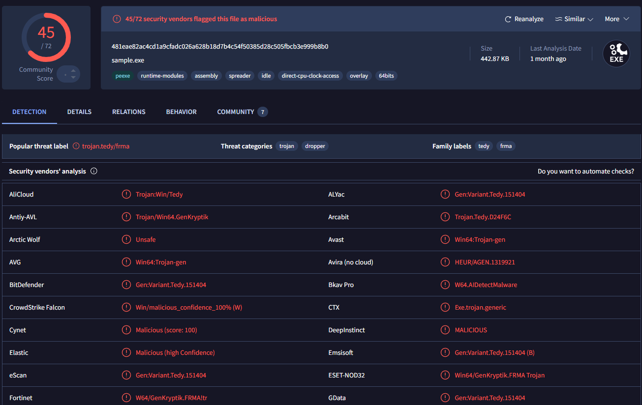 The file was flagged by 45 out of 72 vendors on VirusTotal, which already gives a strong sign that the sample is malicious.