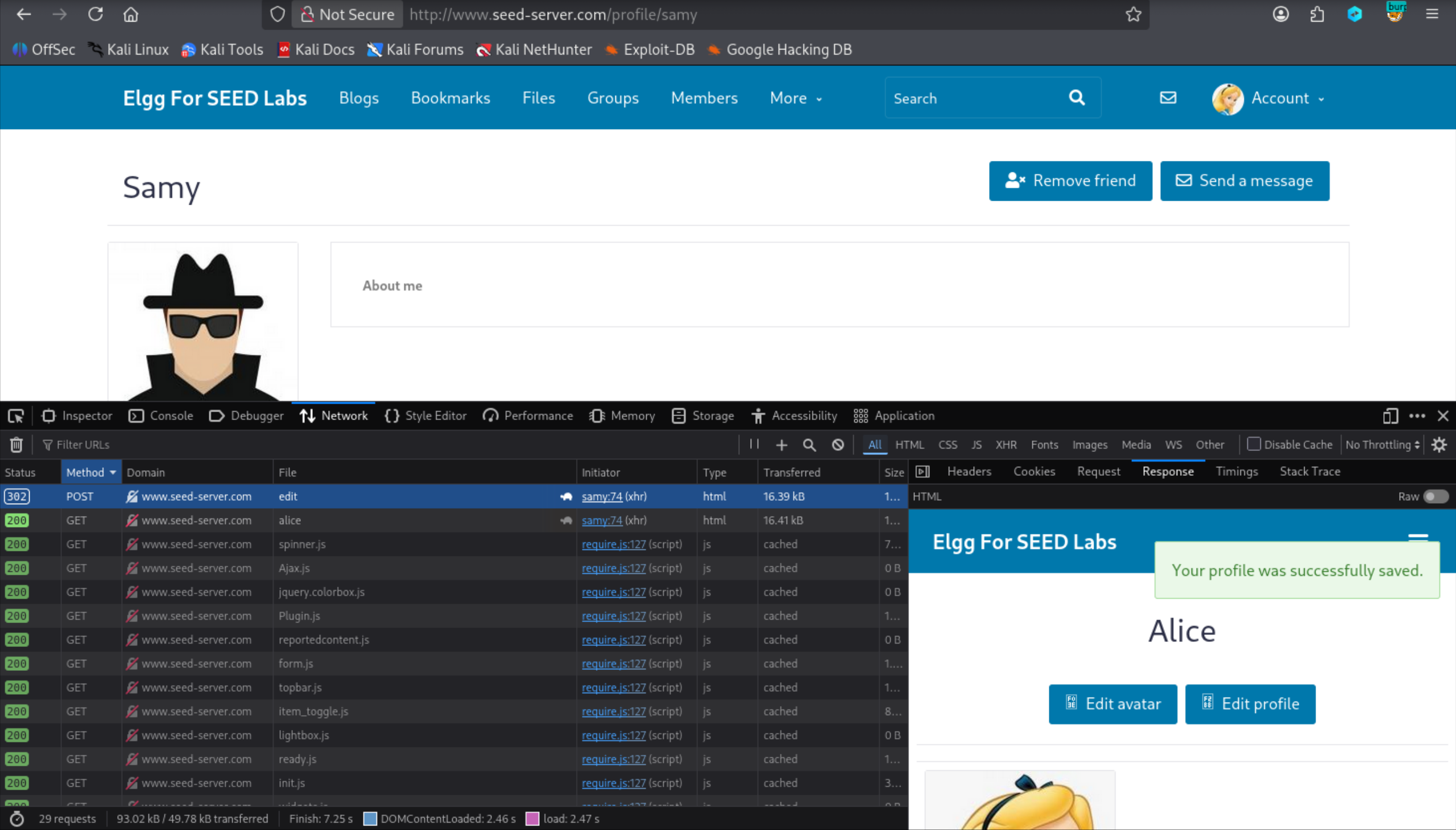 The network tab confirms the GET request was sent, successfully adding Samy to Alice’s friend list.