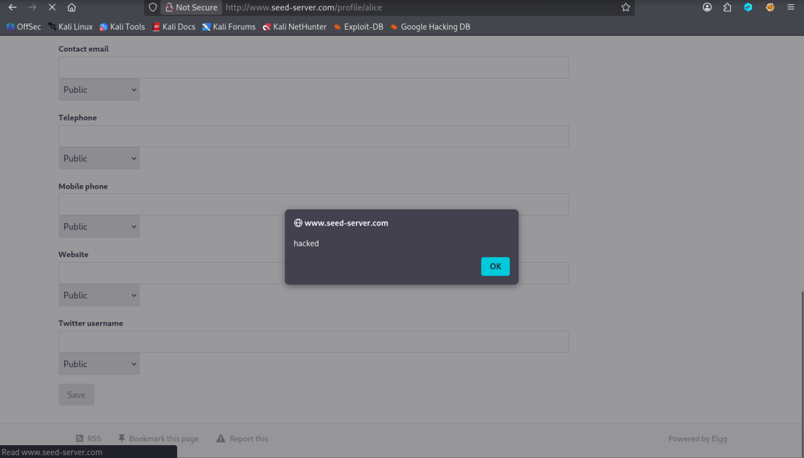 This captured cookie (Elgg=to8cmeaafevbh5d47tib20l7ui) can be used to impersonate the user.