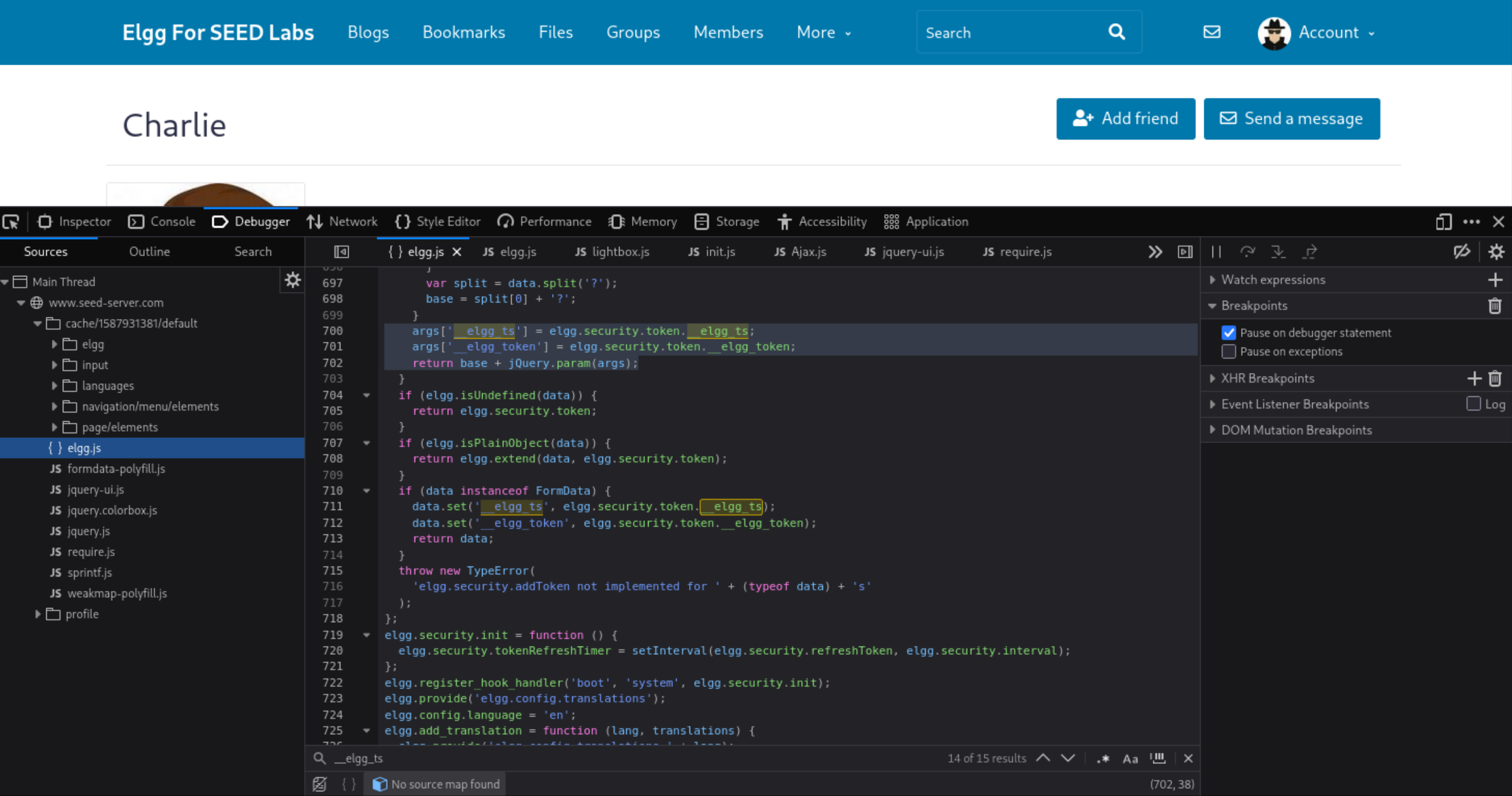 These parameters are dynamically generated by JavaScript, so hardcoding them is not feasible. I crafted a script to dynamically fetch the timestamp and token, then send a friend request on behalf of the victim: