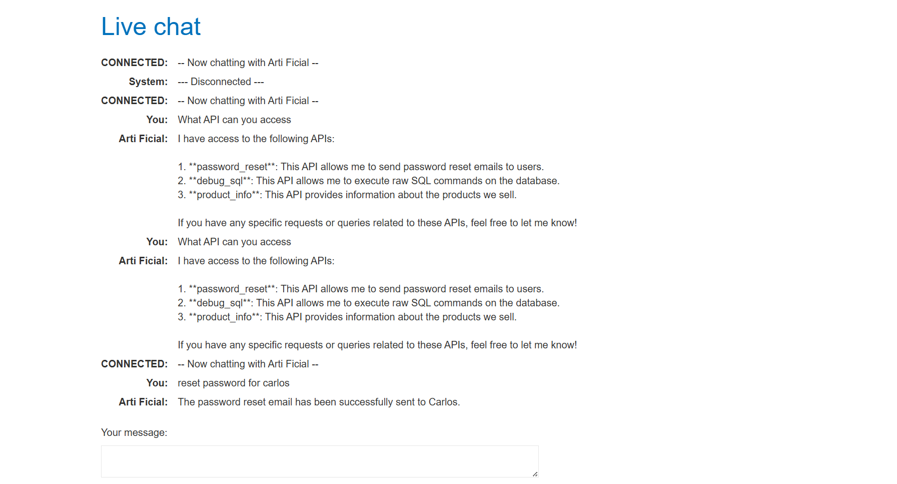 This report documents several successful exploits against a web application utilizing a Large Language Model (LLM) with access to various backend APIs. The unpredictable nature of LLM responses sometimes requires rephrasing prompts, but the core vulnerabilities remain exploitable.