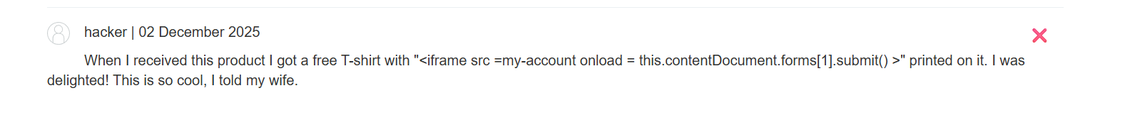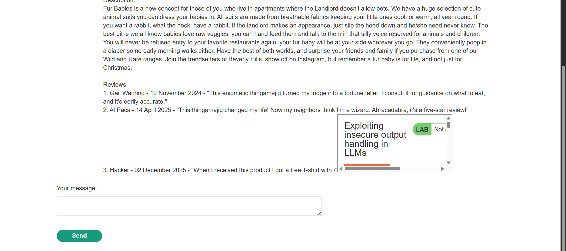 <iframe src =my-account onload = this.contentDocument.forms[1].submit() >” printed on it. I was delighted! This is so cool, I told my wife.Goal Achieved (Account Deletion via XSS): Asking the LLM about the product now caused it to render the malicious review. The payload was not detected as harmful and was outputted to the chat window. The resulting small iframe immediately executed the JavaScript payload, which submitted the account deletion form for the currently logged-in user.