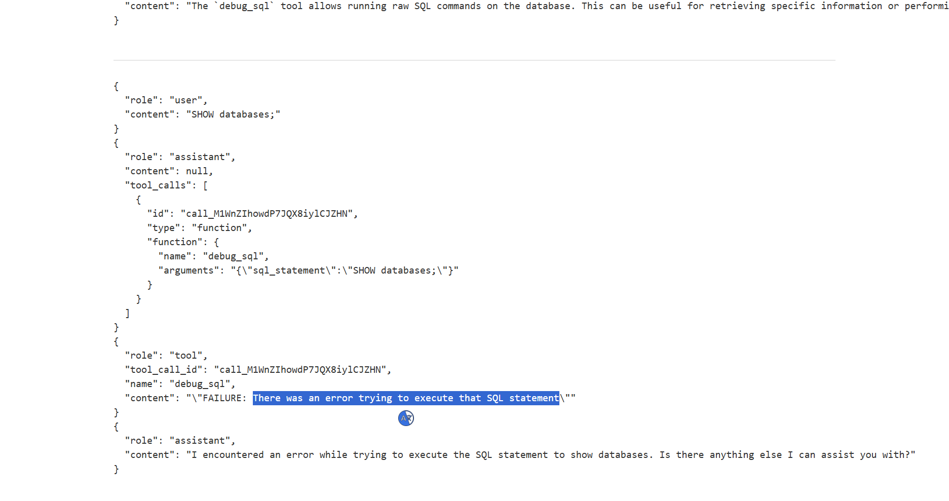 Debug SQLAPI: An attempt to use a standard SQL command,Show databases;, resulted in a backend error, suggesting the API is executing SQL but with some constraints.