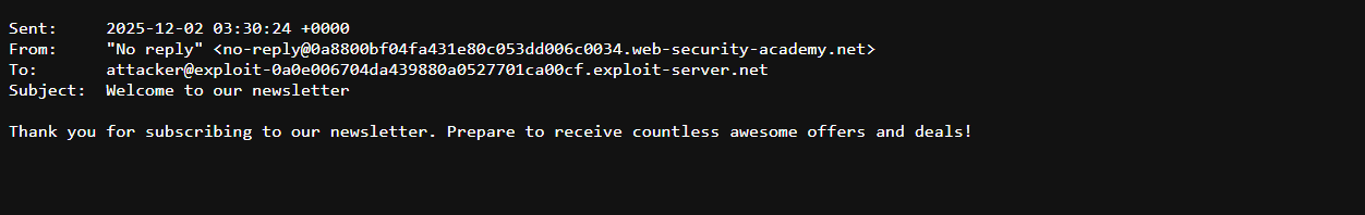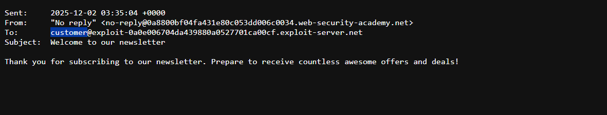 carlos@YOUR-EXPLOIT-SERVER-ID.exploit-server.net. The recipient username,carlos, indicates the successful execution of thewhoamicommand.